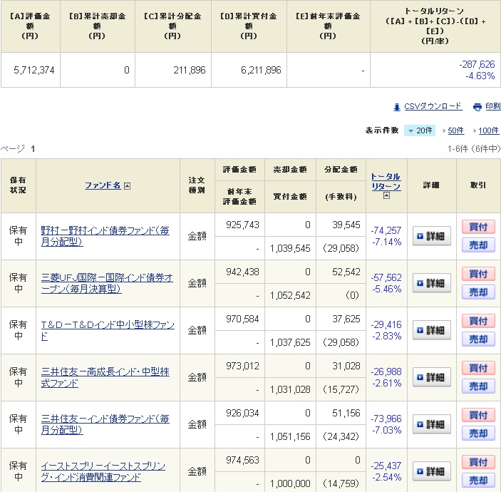 以前紹介したインドの投資信託の中から中小型のファンドを3本と債券型のファンドを3本の計6本を各100万円分購入しております。