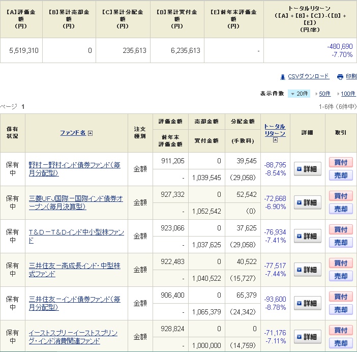 以前紹介したインドの投資信託の中から中小型のファンドを3本と債券型のファンドを3本の計6本を各100万円分購入しております。