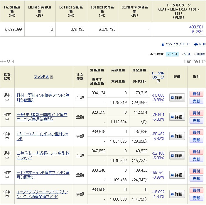 以前紹介したインドの投資信託の中から中小型のファンドを3本と債券型のファンドを3本の計6本を各100万円分購入しております。