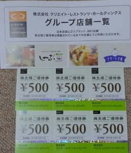 クリエイト・レストランツ・ホールディングス(3387)8月が権利月です。クロス取引で100株の権利を得て3000円分の食事券を頂きました。