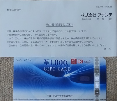 アサンテ(6073)の株主優待が届きました 2018.12.062019.01.21 アサンテ(6073)の株主優待は三菱UFJニコスギフトカードになります。 手数料無料でクロス取引で購入しました。 逆日歩 0 円でした。 権利確定月:3月末、9月末 株主優待内容:三菱UFJニコスギフトカード 100株:1000円分