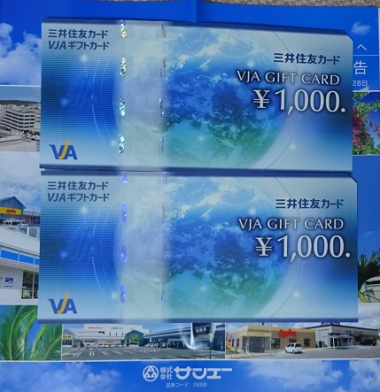 サンエー(2659)の株主優待が届きました 2019.06.05 サンエー(2659)の株主優待は三井住友VJAギフトカード(2,000円相当)です。 手数料無料でクロス取引で購入しました。 権利確定月:2月末