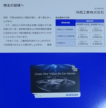 100株で保有期間1年未満のため1000円分のクオカードを頂きました。