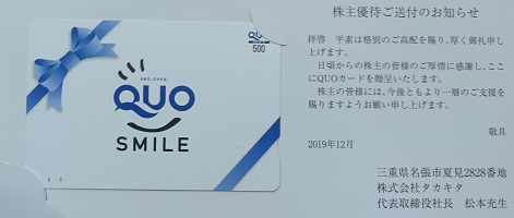 タカキタ(6325)の株主優待が届きました 2019.12.04 タカキタ(6325)の株主優待はクオカードになります。 手数料無料でクロス取引で購入しました。 逆日歩は480円でした。 権利確定月:9月末 株主優待内容:クオカード 100株: 500円分 1000株: 1000円分