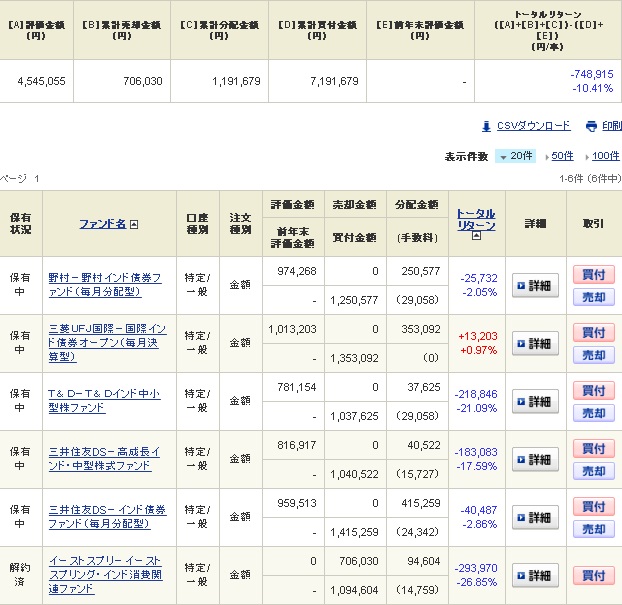 以前紹介したインドの投資信託の中から中小型のファンドを3本と債券型のファンドを3本の計6本を各100万円分購入しております。