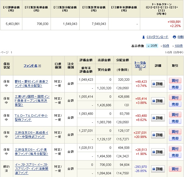 以前紹介したインドの投資信託の中から中小型のファンドを3本と債券型のファンドを3本の計6本を各100万円分購入しております。