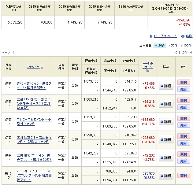 以前紹介したインドの投資信託の中から中小型のファンドを3本と債券型のファンドを3本の計6本を各100万円分購入しております。