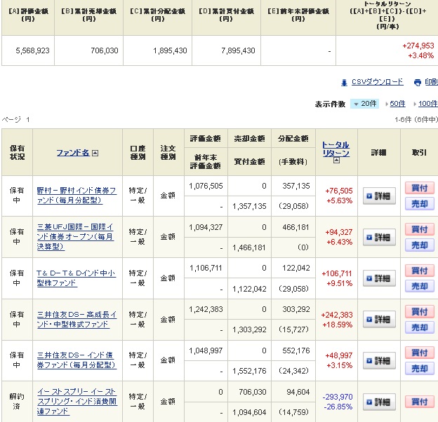 以前紹介したインドの投資信託の中から中小型のファンドを3本と債券型のファンドを3本の計6本を各100万円分購入しております。