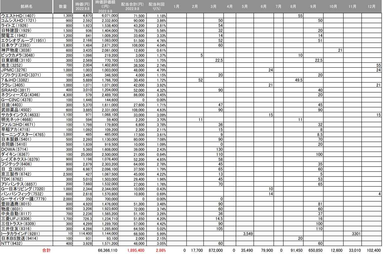 全保有銘柄の年間配当予想額です。(2022.9.8時点)