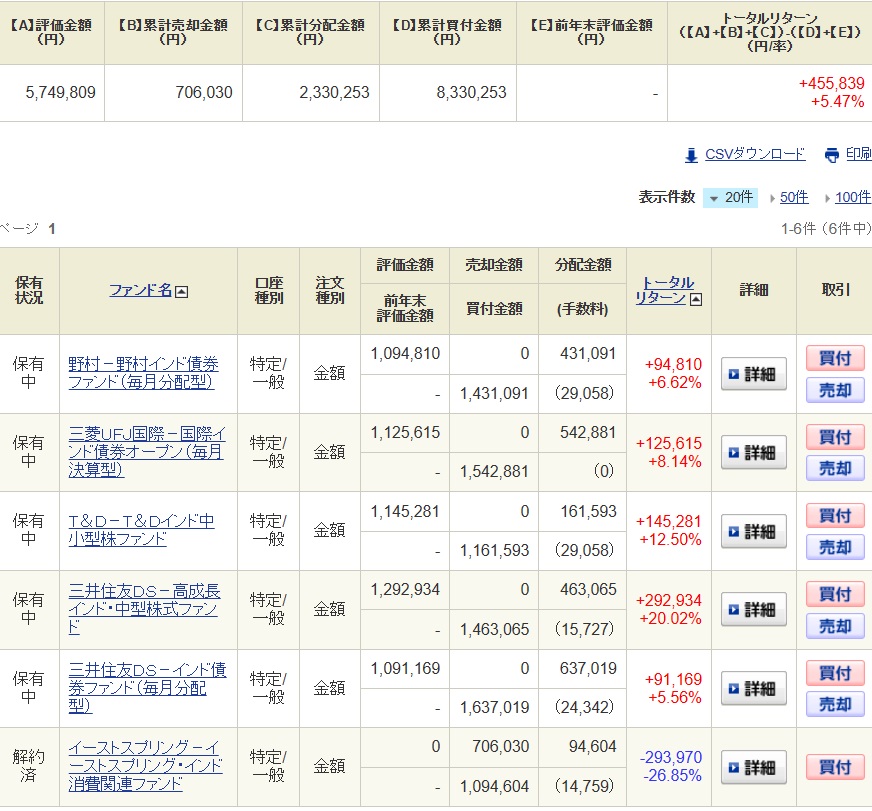 以前紹介したインドの投資信託の中から中小型のファンドを3本と債券型のファンドを3本の計6本を各100万円分購入しております。