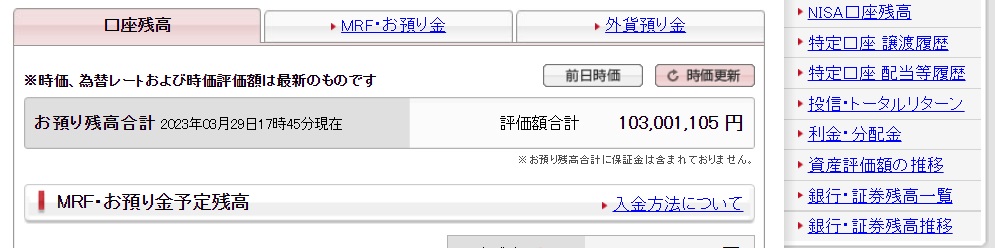 いつもは、証券口座に現金は多くは入れてませんが、3月期の株主優待のクロス取引のため、証券口座に動かしました。合計値が1億円を超えていました。