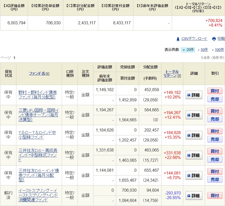 以前紹介したインドの投資信託の中から中小型のファンドを3本と債券型のファンドを3本の計6本を各100万円分購入しております。