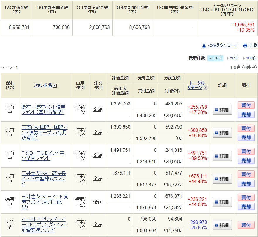 以前紹介したインドの投資信託の中から中小型のファンドを3本と債券型のファンドを3本の計6本を各100万円分購入しております。