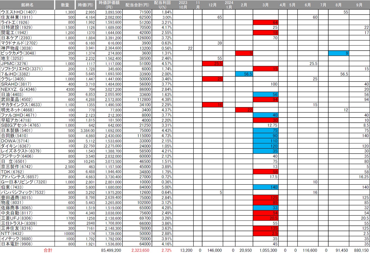 先月分より各銘柄の株価が上昇したため、配当予想利回りは下がりました。
