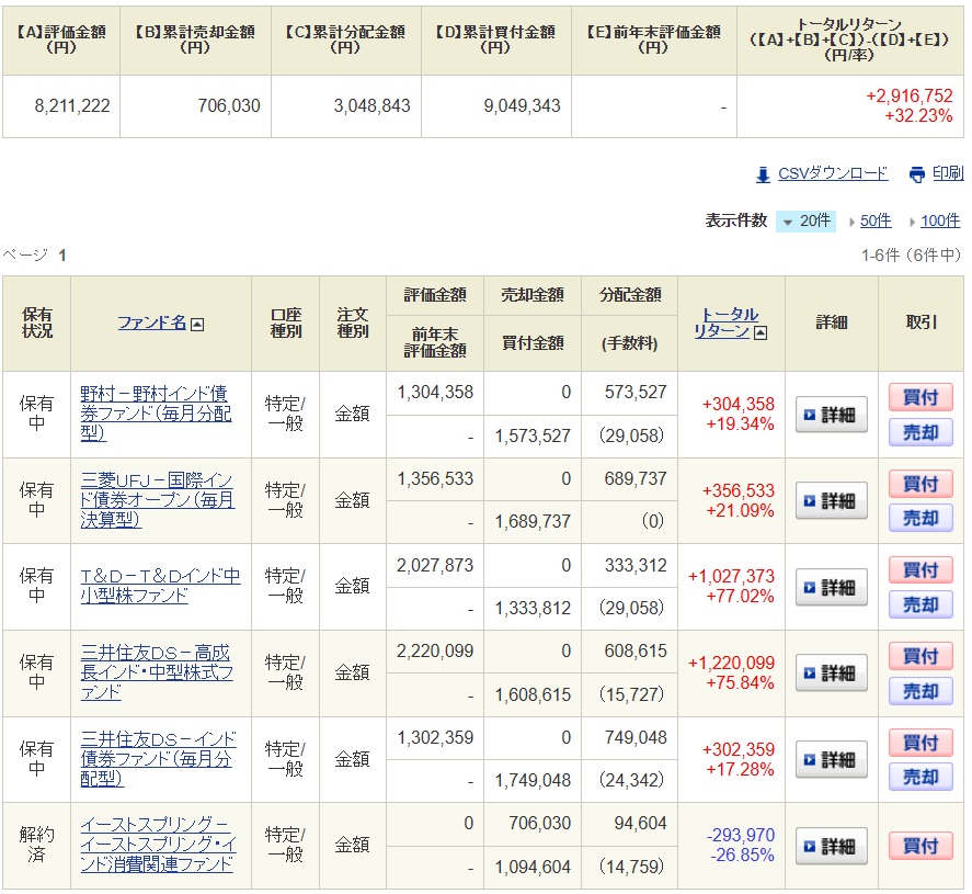 以前紹介したインドの投資信託の中から中小型のファンドを3本と債券型のファンドを3本の計6本を各100万円分購入しております。