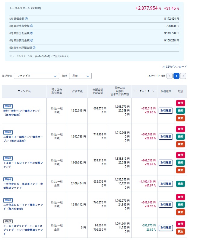 以前紹介したインドの投資信託の中から中小型のファンドを3本と債券型のファンドを3本の計6本を各100万円分購入しております。