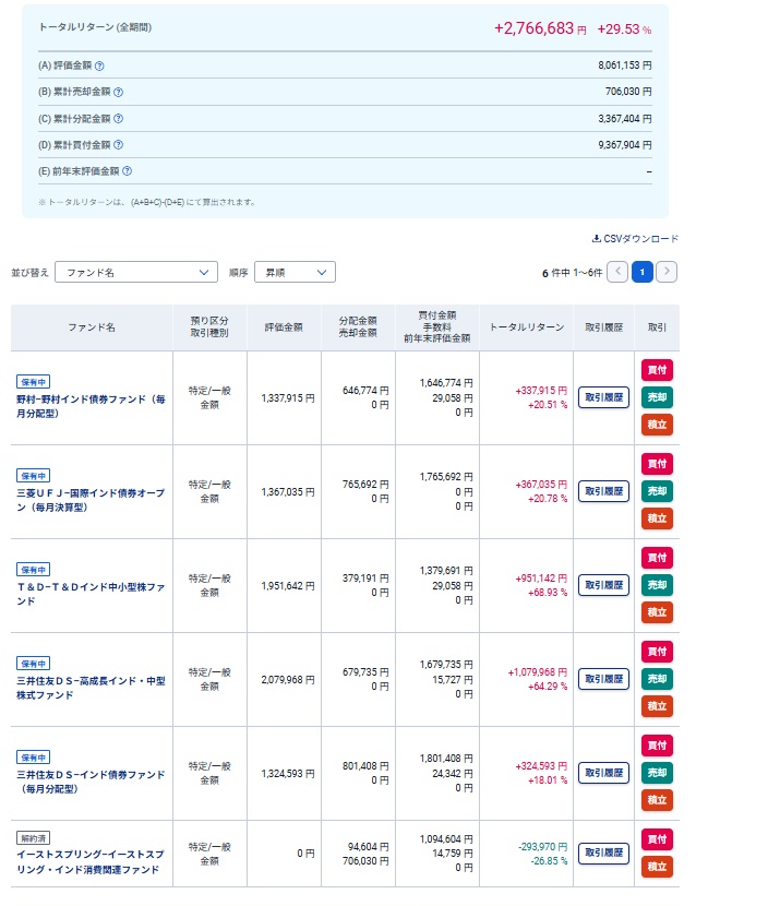 以前紹介したインドの投資信託の中から中小型のファンドを3本と債券型のファンドを3本の計6本を各100万円分購入しております。