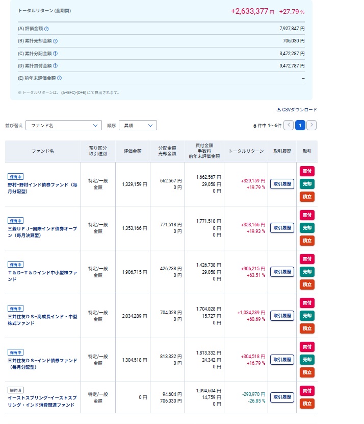 以前紹介したインドの投資信託の中から中小型のファンドを3本と債券型のファンドを3本の計6本を各100万円分購入しております。