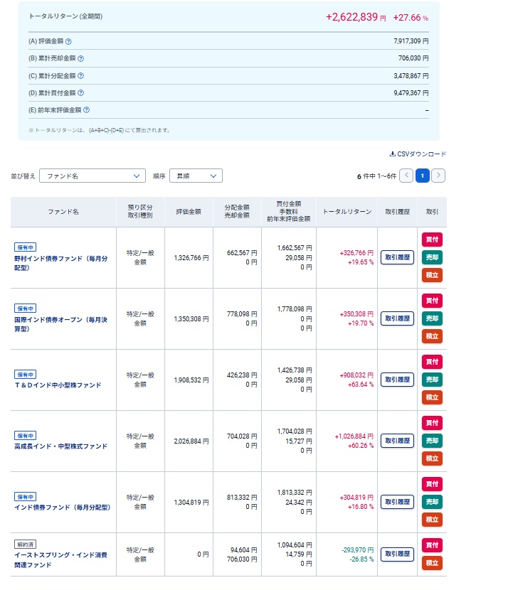 以前紹介したインドの投資信託の中から中小型のファンドを3本と債券型のファンドを3本の計6本を各100万円分購入しております。