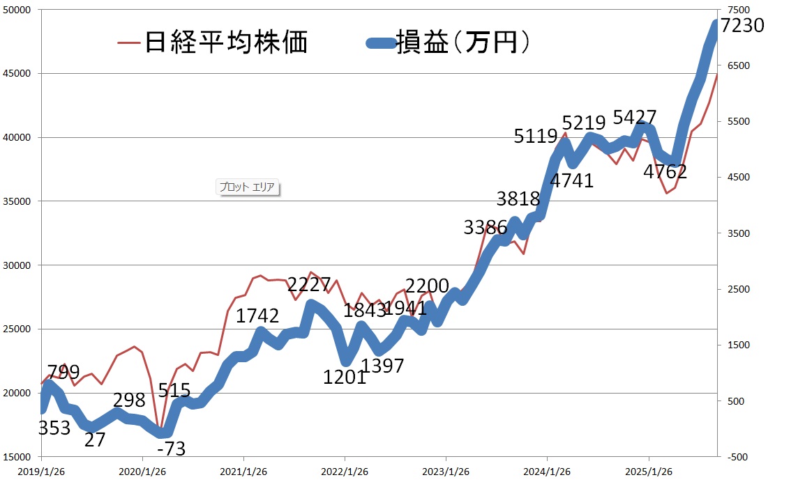 2019年~現在(2025.9末)までの損益グラフ(各月末)です。