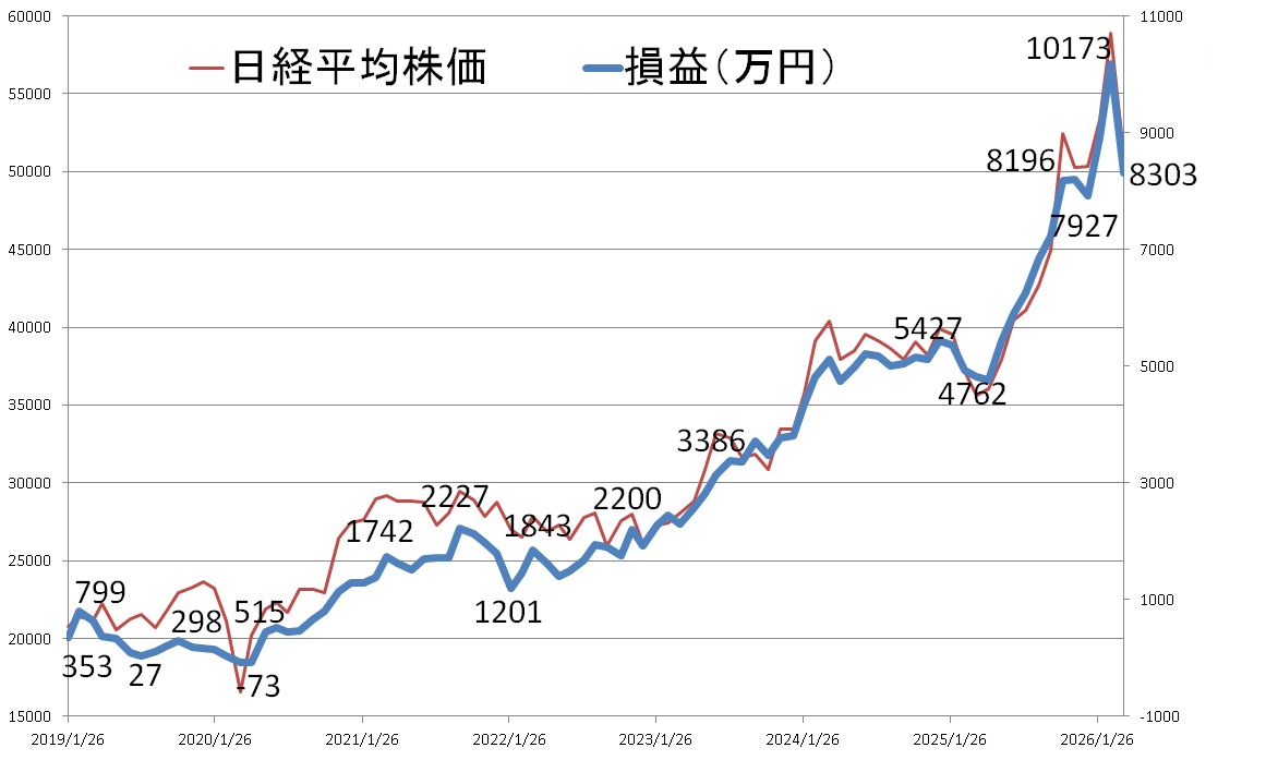 高配当株中心の長期投資により、累計損益は+8303万円(2026年3月末時点)となりました。